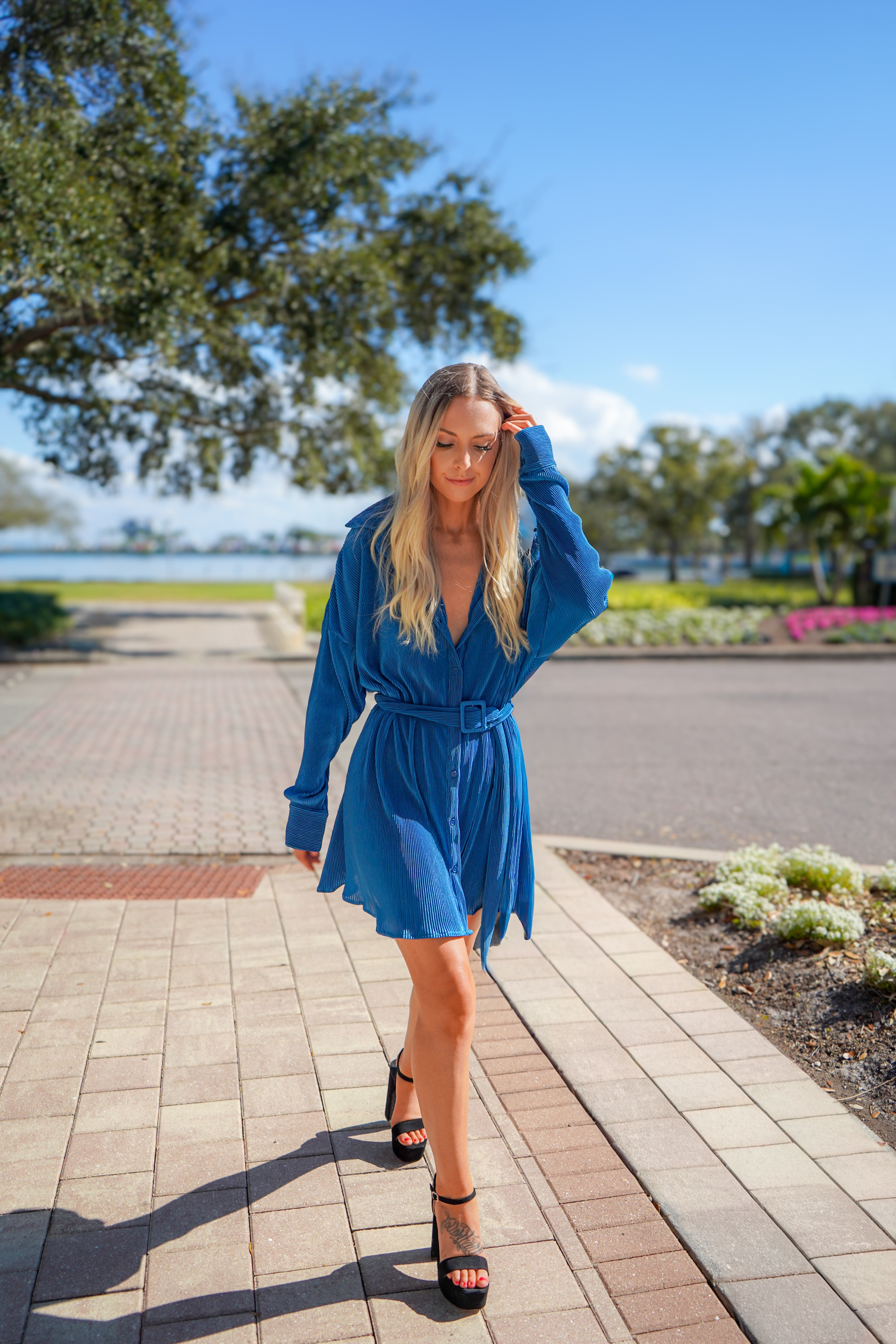 Stylishly designed, our Retro Radiant Dress is sure to turn heads. The shades of retro blue and wavy texture, with a belt detail to form your figure create a timeless dress to elevate your style no matter the occasion.